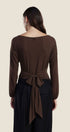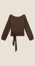 Top a maniche lunghe con nodo posteriore e scollo a barca. Linea semplice ma curata, ideale per look casual o da ufficio. I polsini arricciati aggiungono un tocco femminile e raffinato.Prezzo normale