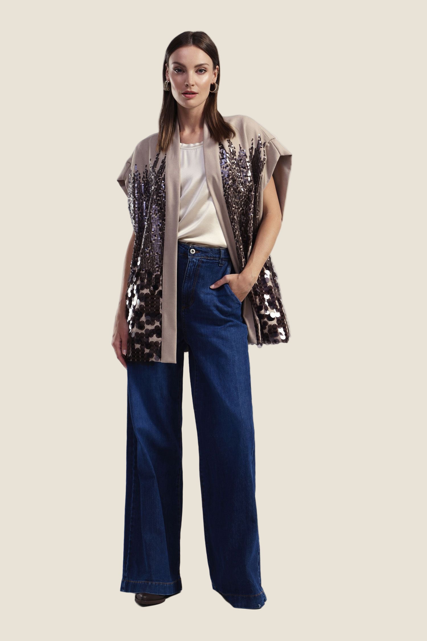 Jeans a gamba larga in blu denim con vita alta, pensati per valorizzare la silhouette e offrire massimo comfort. Perfetti per look casual o eleganti, da abbinare facilmente con bluse e top per uno stile sempre attuale.Prezzo normale