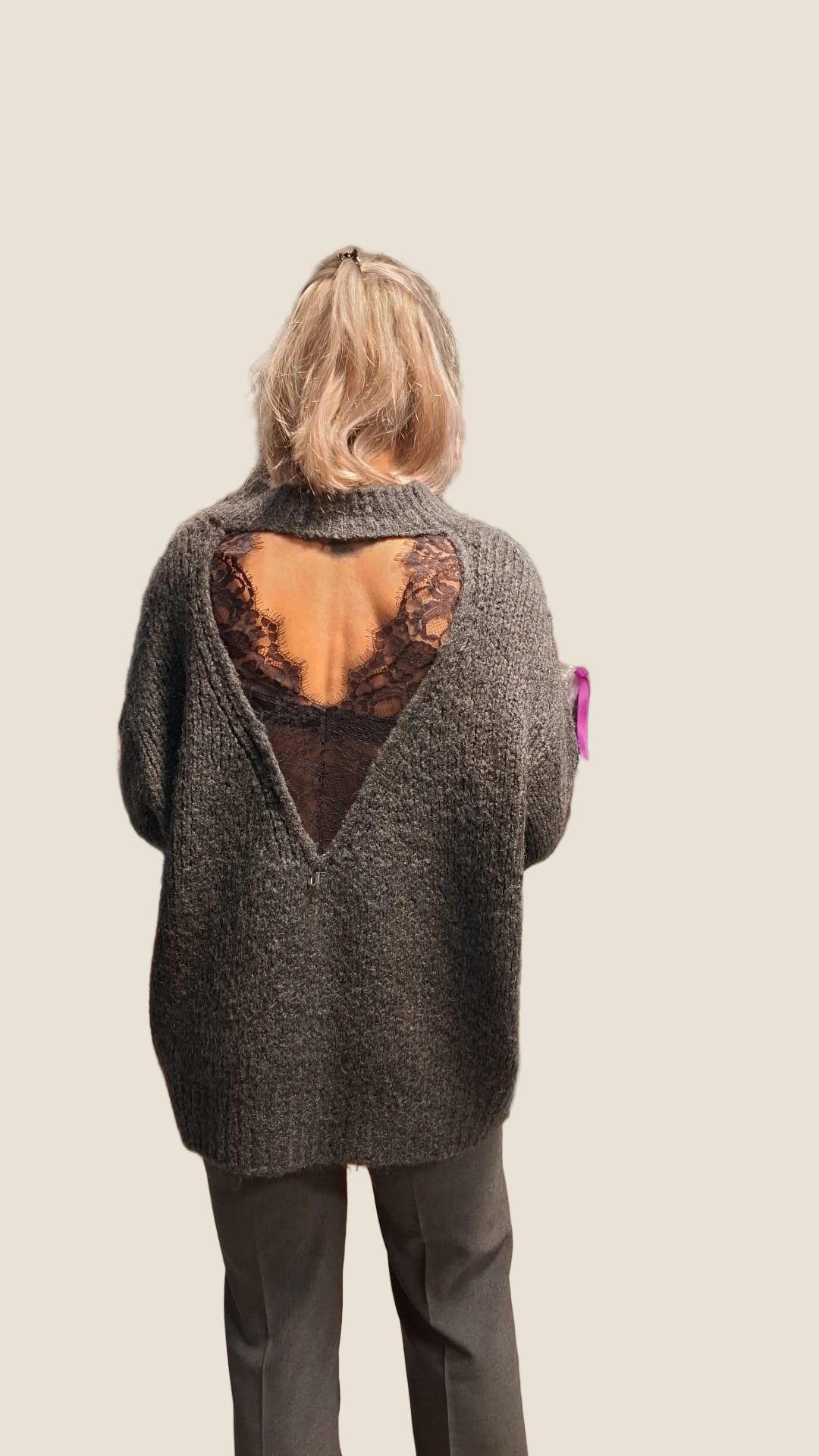 Maglione girocollo a maniche lunghe con profondo scollo sulla schiena rifinito in pizzo. Spalle scese e bordo a coste per una vestibilità morbida e femminile.Prezzo normale