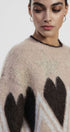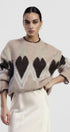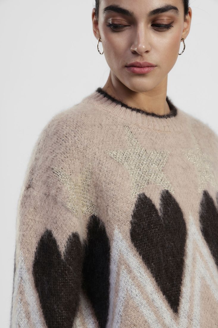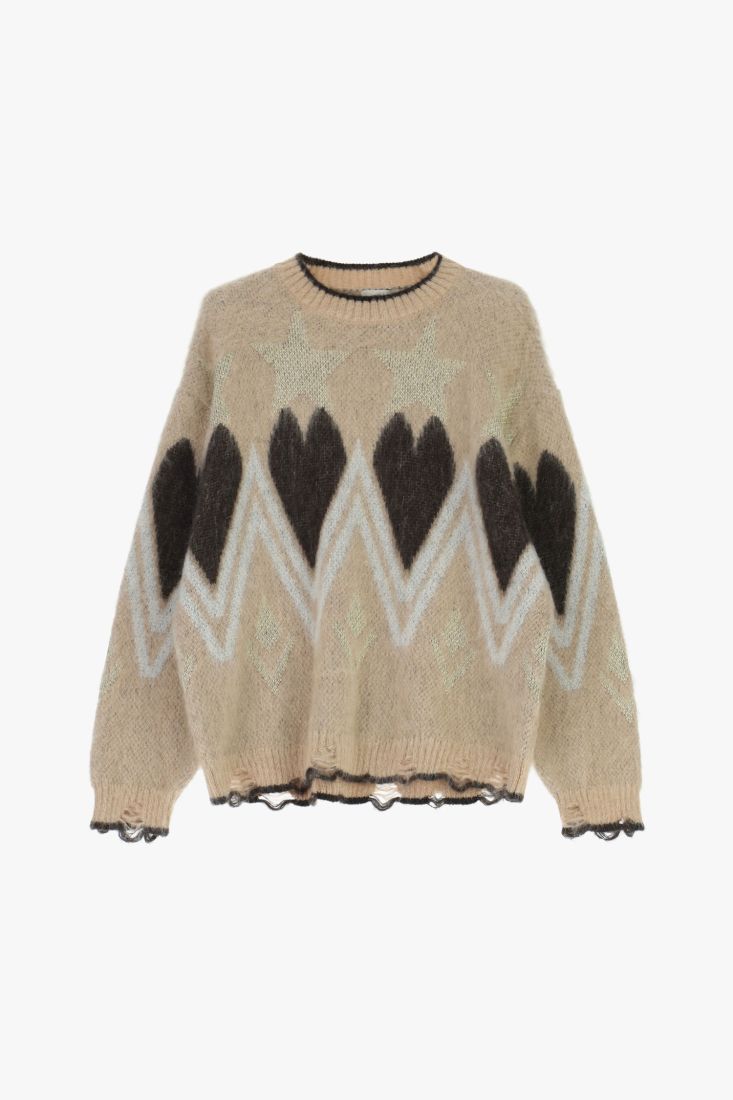 Maglione morbido e confortevole con motivo a cuori e stelle, maniche lunghe e bordo leggermente ondulato. Perfetto per aggiungere un tocco originale a ogni look quotidiano.Prezzo normale