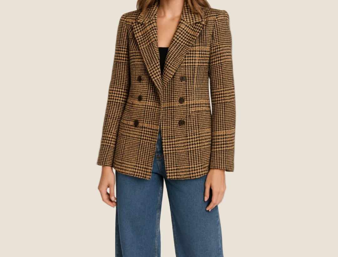 Giacca doppiopetto a quadri nei toni del cammello e del marrone, realizzata in tessuto morbido e strutturato. Unisce comfort, stile e un’eleganza senza tempo.Prezzo normale