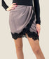 Gonna corta elegante con design incrociato e bordo in pizzo nero. Morbida, femminile e valorizzante, grazie al taglio a portafoglio che crea un delicato drappeggio.Prezzo normale