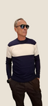 Maglia a maniche lunghe in viscosa mano seta, morbida e liscia al tatto. Il design moderno con fasce blu e avorio dona eleganza e comfort, perfetta per un look casual chic.Prezzo normale