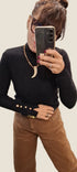 Maglia dolcevita da donna in misto viscosa, morbida e confortevole. La vestibilità slim valorizza la silhouette, mentre i bottoni dorati sui polsini aggiungono un tocco di eleganza.Prezzo normale
