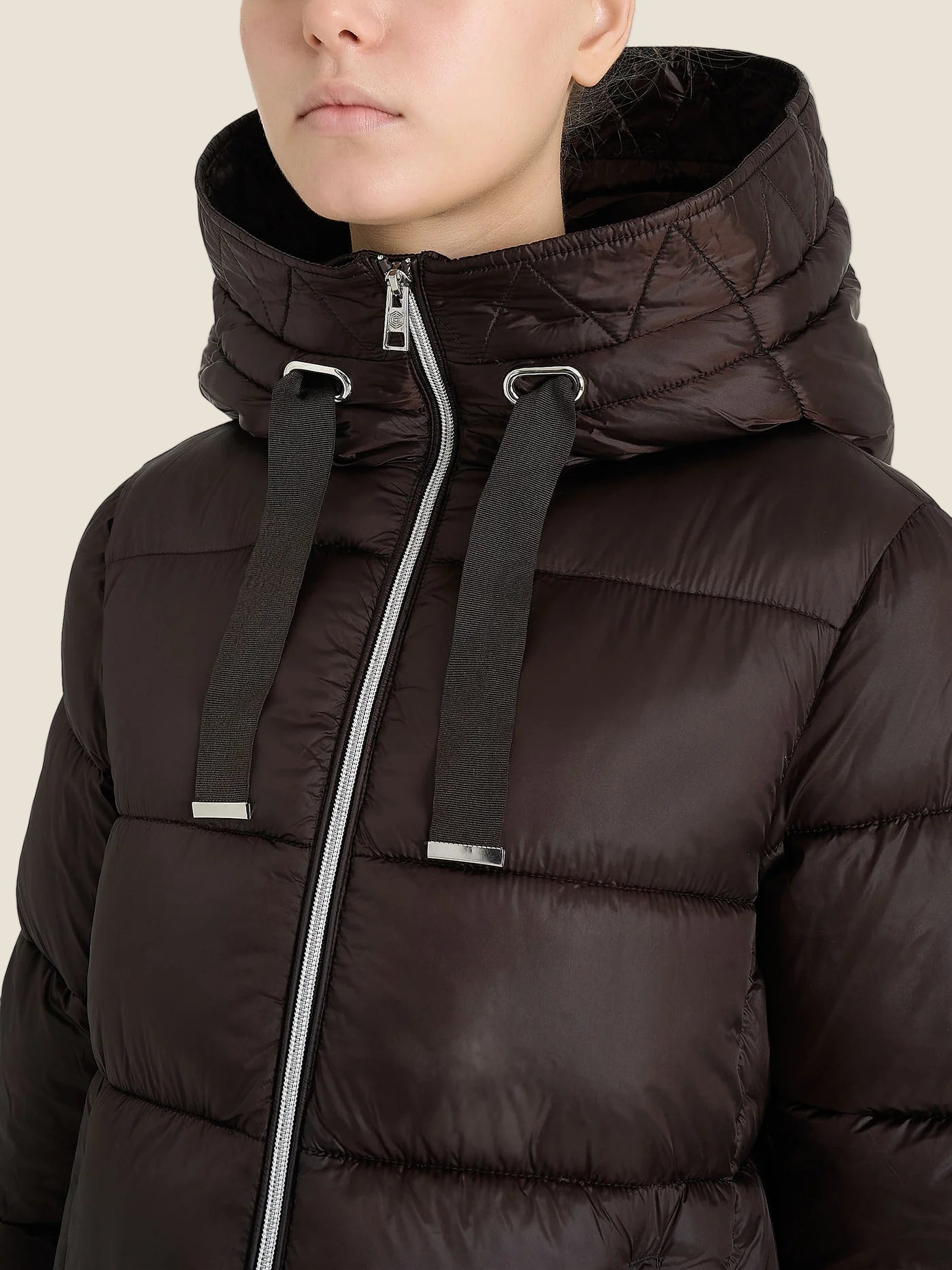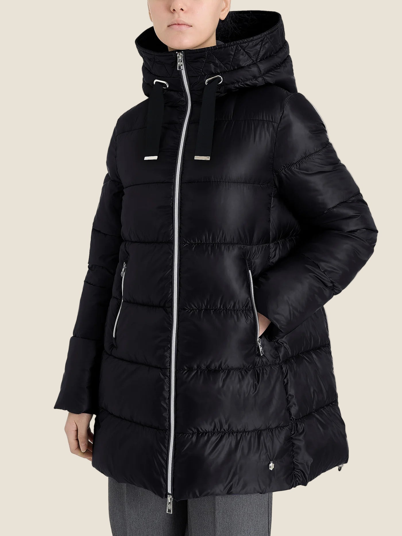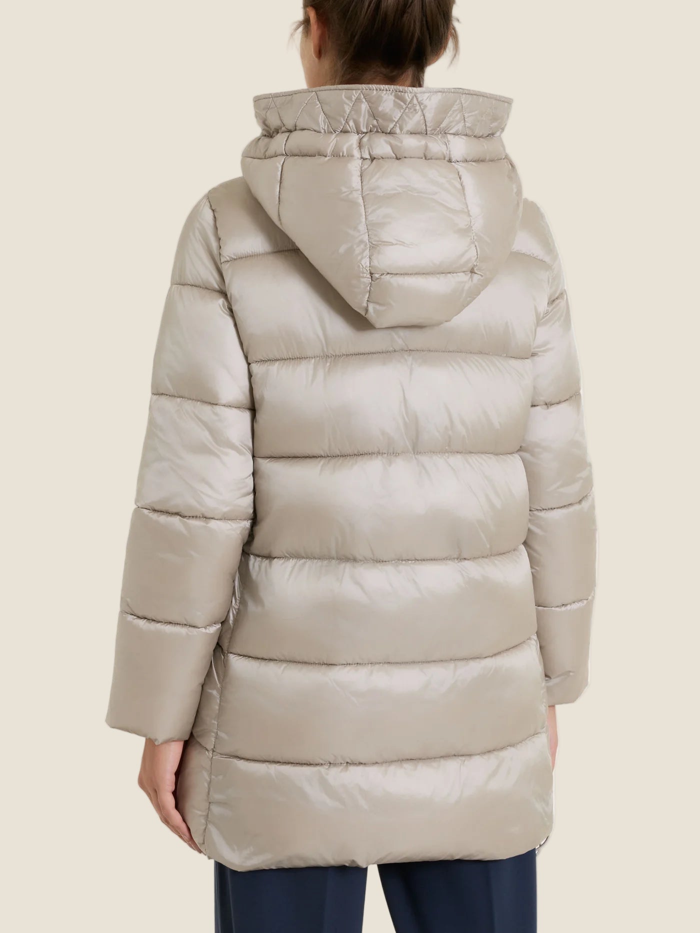 Piumino lungo da donna in vegan down con finitura lucida e cappuccio regolabile. Caldo, leggero e cruelty-free, unisce stile moderno e comfort per affrontare l’inverno con eleganza.Prezzo normale