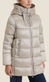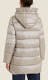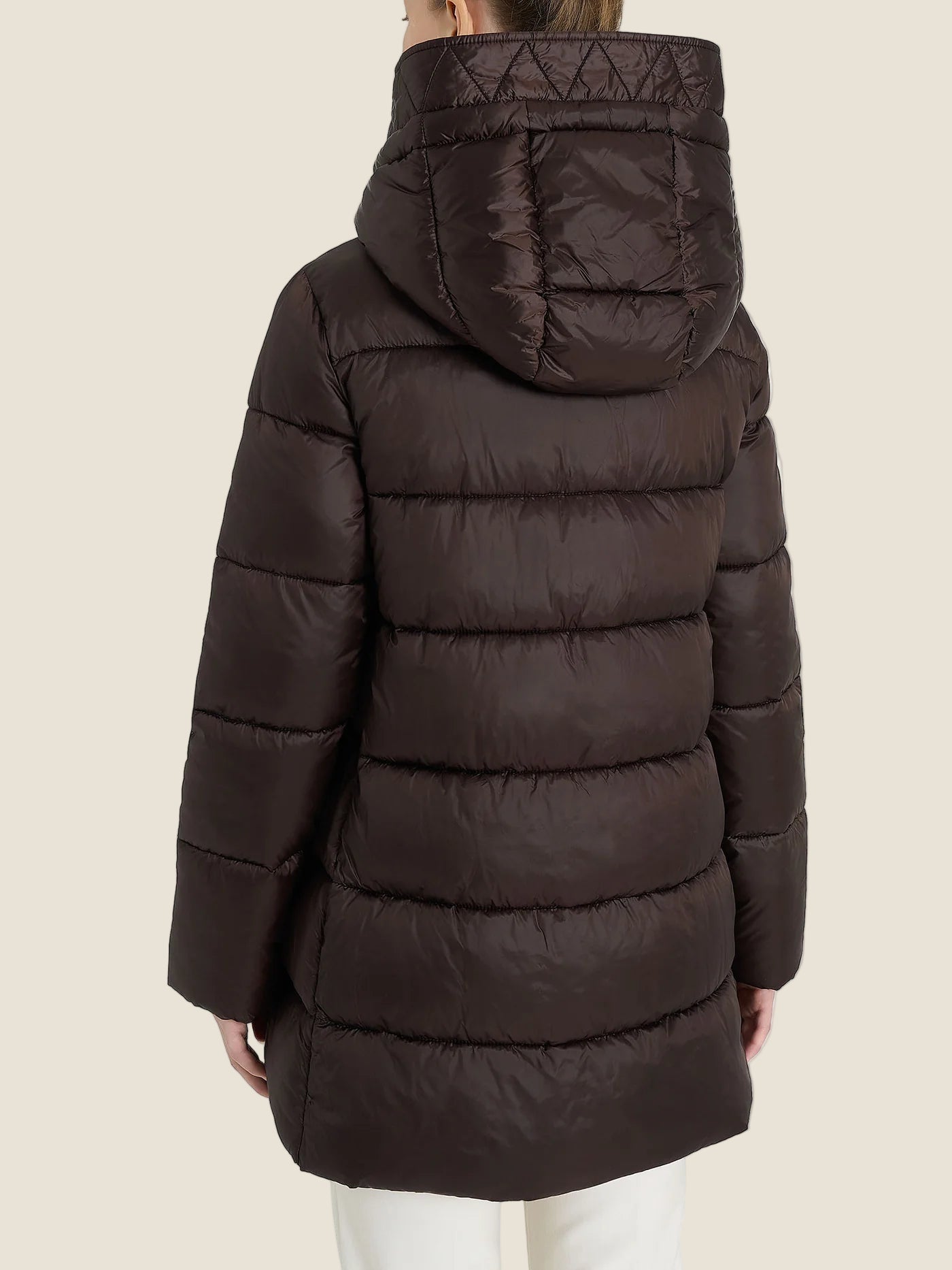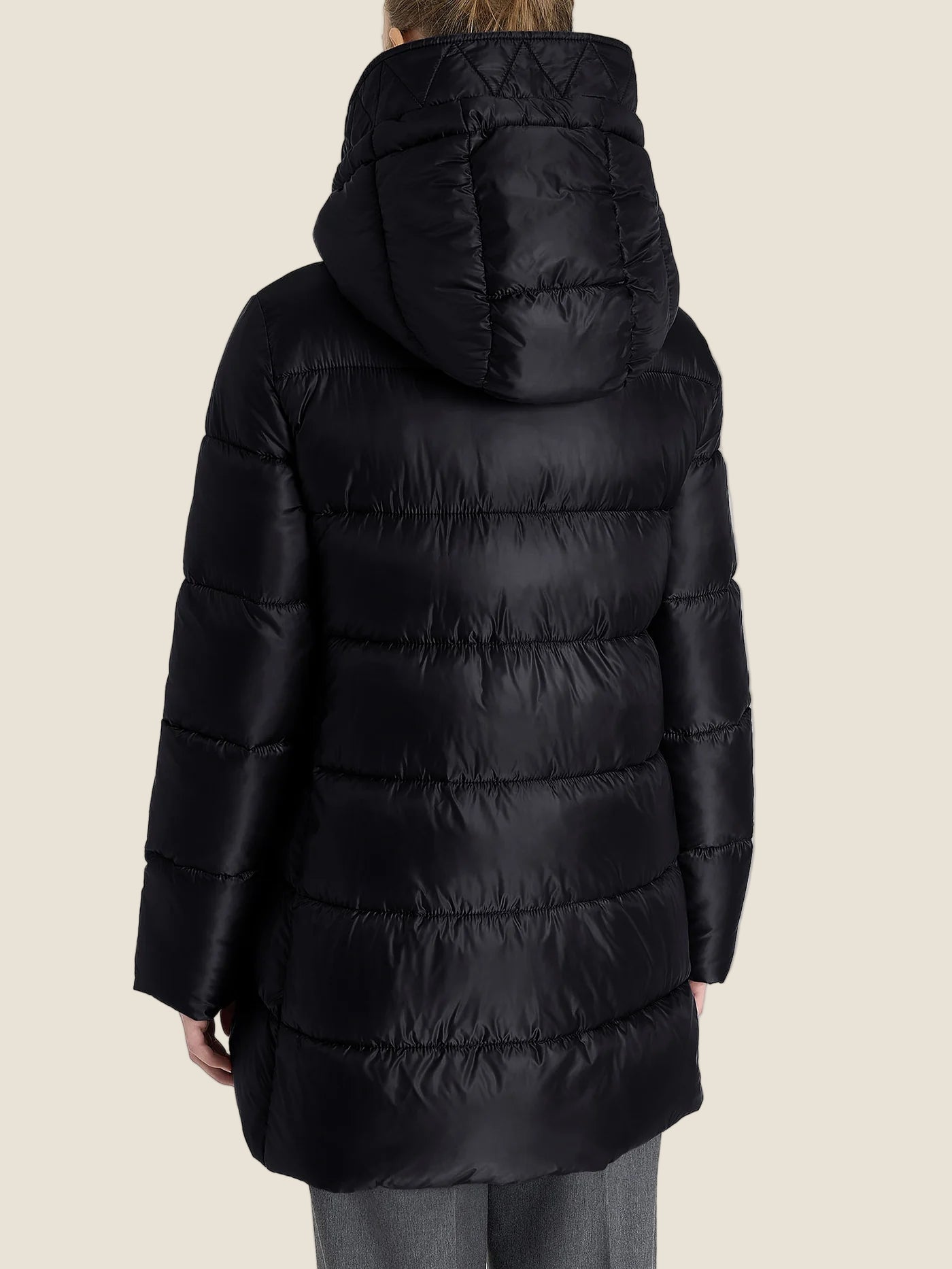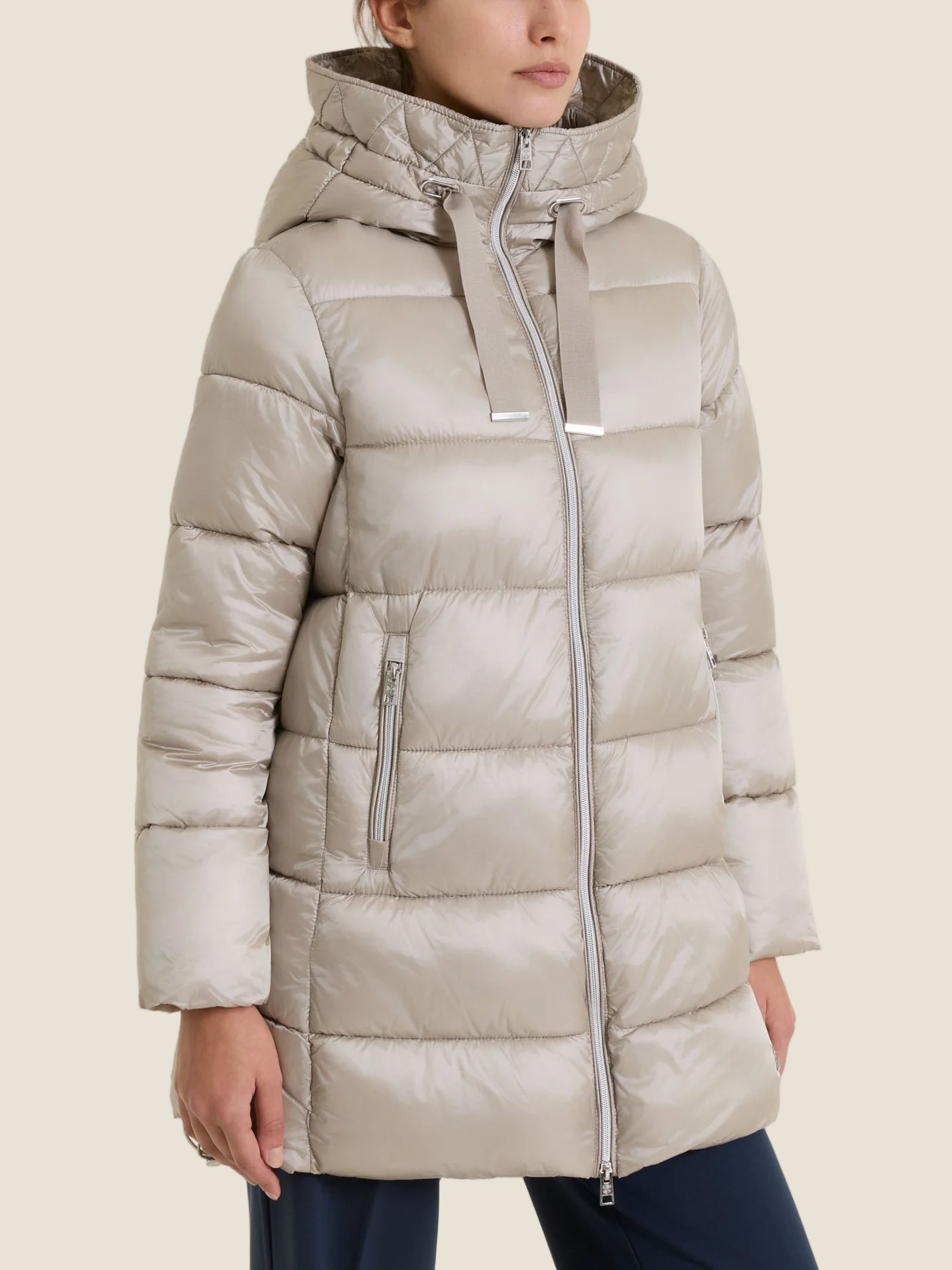 Piumino lungo da donna in vegan down con finitura lucida e cappuccio regolabile. Caldo, leggero e cruelty-free, unisce stile moderno e comfort per affrontare l’inverno con eleganza.Prezzo normale