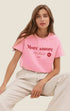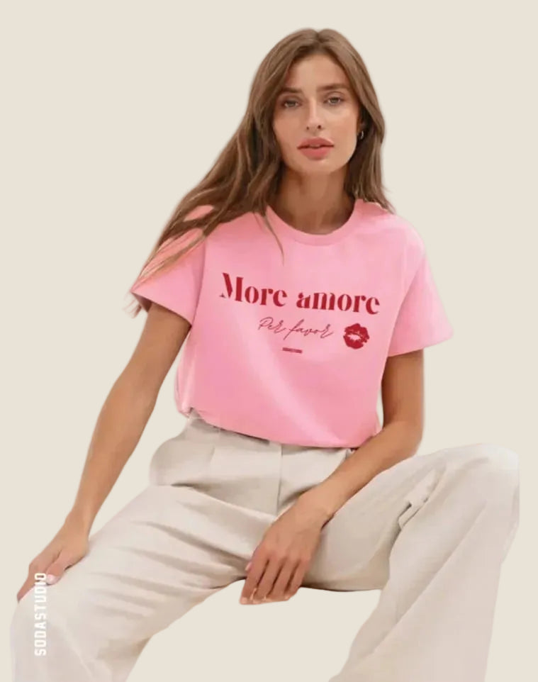 T-shirt donna in cotone organico con mezza manica e stampa “more amore”. Comoda, sostenibile e dal messaggio positivo.Prezzo normale