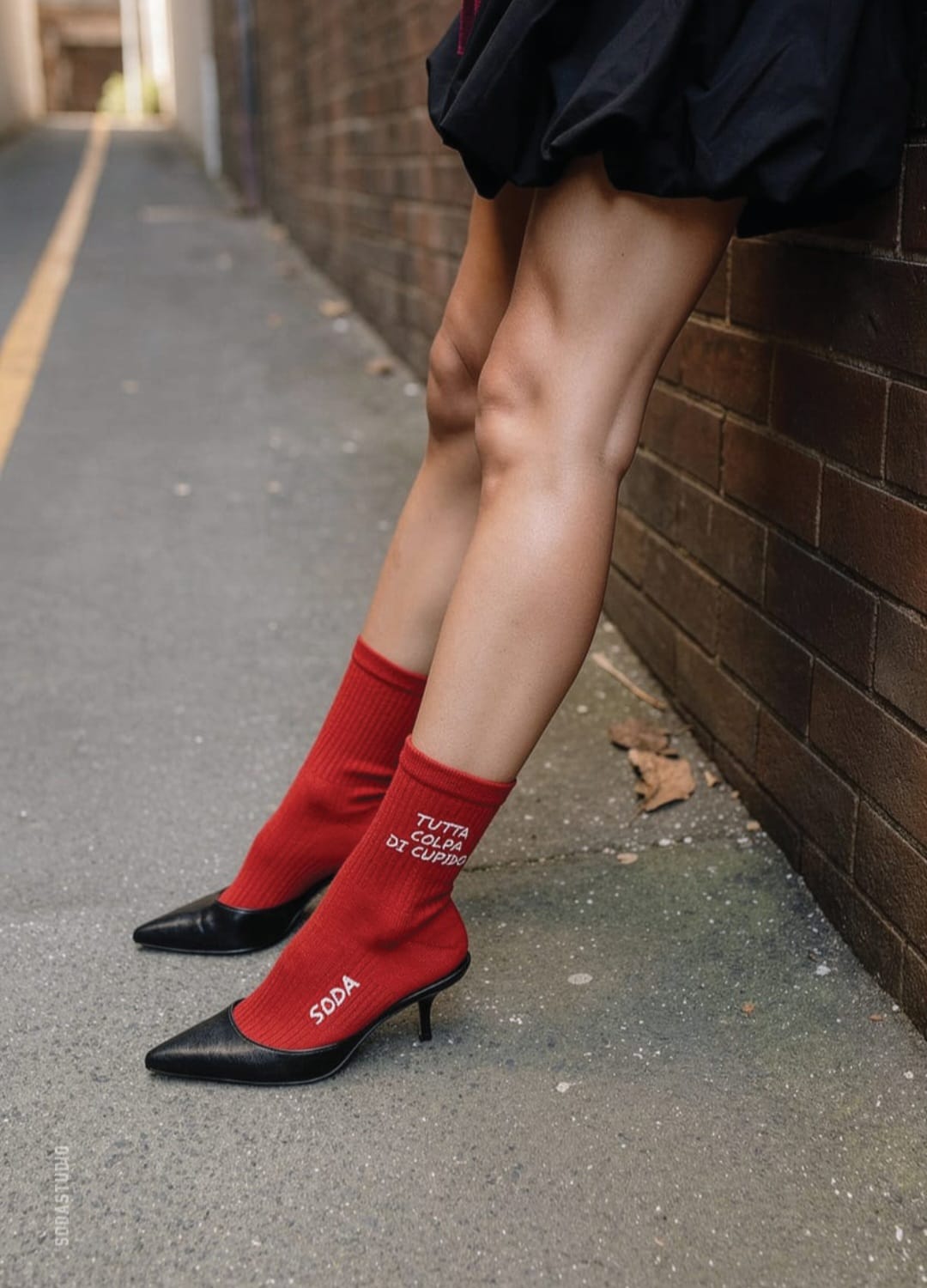 Il design è caratterizzato dalla scritta ricamata a contrasto sul retro e dal logo "SODA" sul collo del piede, rendendole ideali da abbinare sia a un paio di sneakers chunky che a una décolleté per un look urban-chic sofisticato. Che sia San Valentino o un lunedì qualunque, ricorda a tutti che è sempre "Tutta Colpa di Cupido".