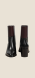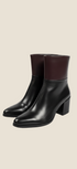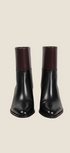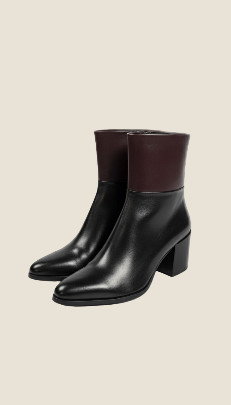 Eleganza e comfort in un solo gesto. Questi stivaletti in pelle liscia bicolor nero-vino donano un tocco raffinato a ogni outfit grazie alla silhouette affusolata, al tacco largo e alla pratica chiusura zip laterale.Prezzo normale